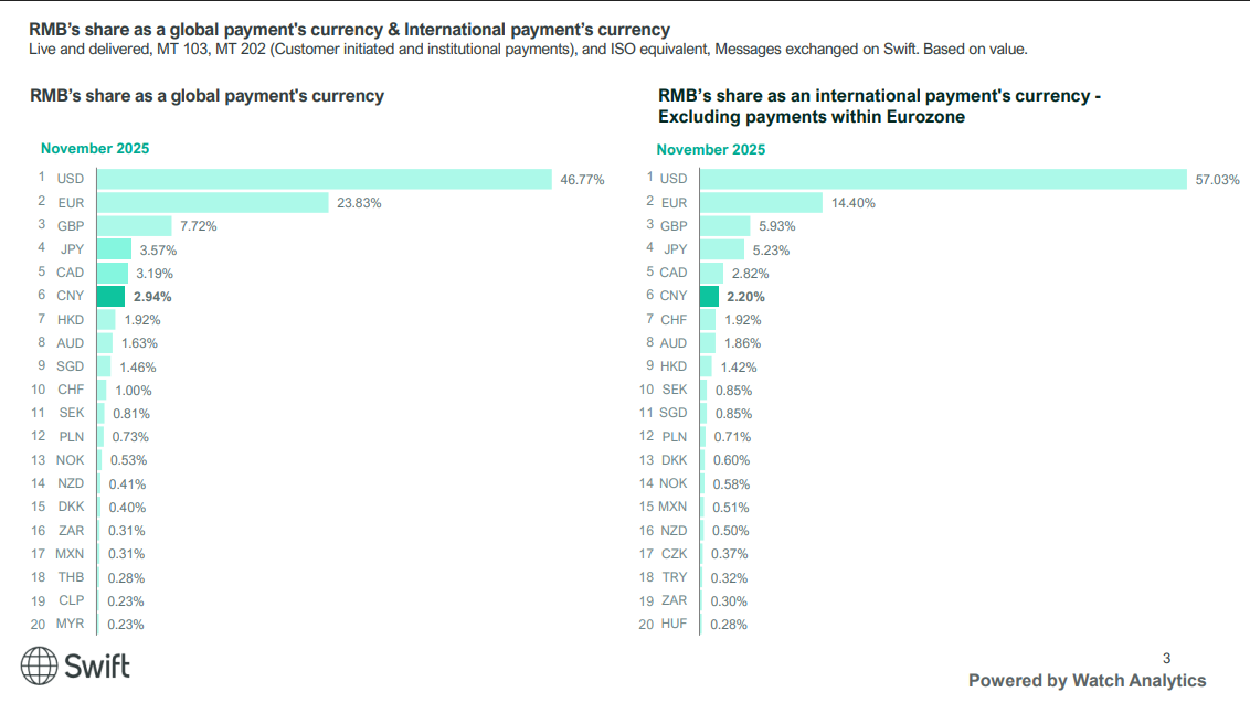 环球银行金融电信协会(Swift)当地时间12月17日发布人民币月度报告和数据统计显示,11月,在基于金额统计的全球支付货币排名中,人民币排名全球第六大最活跃货币的位置,占比2.94%,以欧元区以外的国际支付作为统计口径,人民币位列第六,占比2.20%。