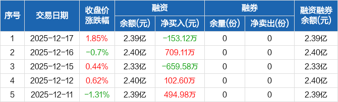 融资方面,当日融资买入1410.21万元,融资偿还1563.33万元,融资净偿还153.12万元。融券方面,融券卖出0份,融券偿还0份,融券余量0份,融券余额0元。融资融券余额合计2.39亿元。