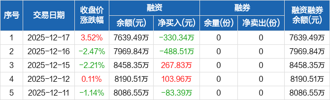 融资方面,当日融资买入1119.66万元,融资偿还1450.01万元,融资净偿还330.34万元。融券方面,融券卖出0份,融券偿还0份,融券余量0份,融券余额0元。融资融券余额合计7639.49万元。
