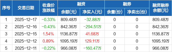 融资方面,当日融资买入345.24万元,融资偿还378.12万元,融资净偿还32.88万元。融券方面,融券卖出0份,融券偿还0份,融券余量0份,融券余额0元。融资融券余额合计809.48万元。