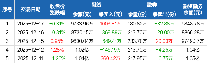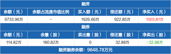 融资方面,当日融资买入1926.66万元,融资偿还922.85万元,融资净买入1003.81万元。融券方面,融券卖出0份,融券偿还32.88万份,融券余量180.82万份,融券余额114.82万元。融资融券余额合计9848.78万元。