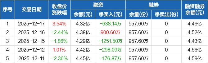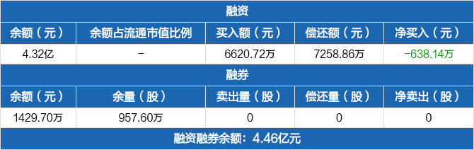 融资方面,当日融资买入6620.72万元,融资偿还7258.86万元,融资净偿还638.14万元。融券方面,融券卖出0份,融券偿还0份,融券余量957.6万份,融券余额1429.7万元。融资融券余额合计4.46亿元。