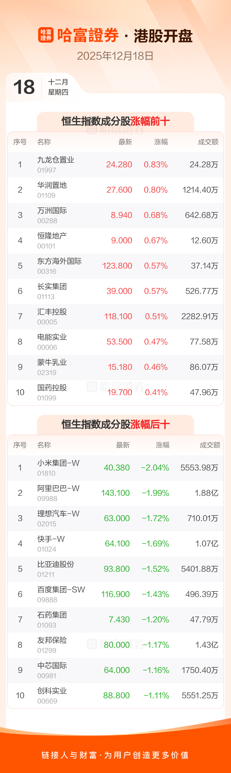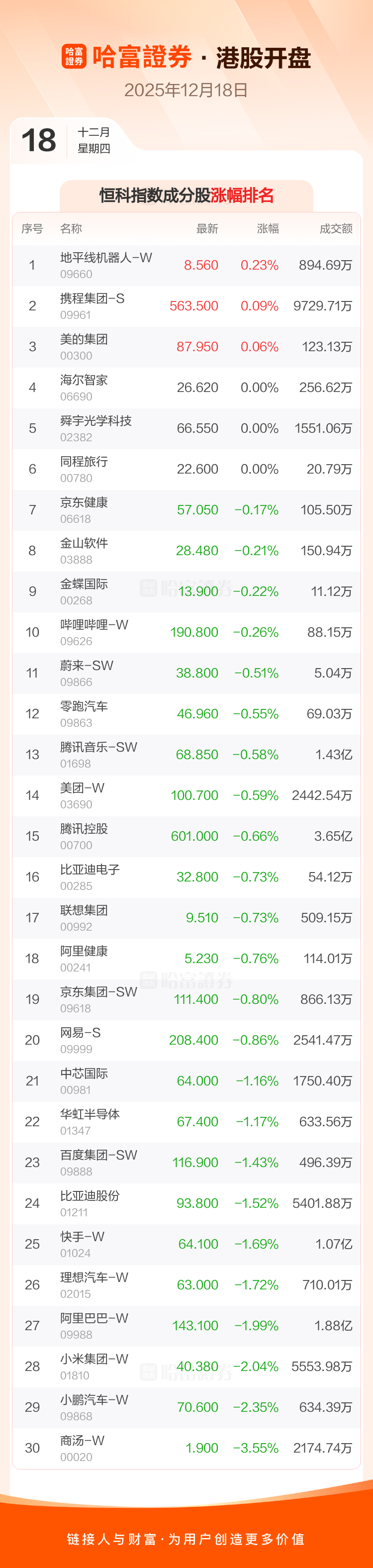 港股12月18日低开 ,恒生指数开盘报25330.83点,跌137.95点,跌幅0.54%;恒生科技指数开盘报5397.34点,跌60.61点,跌幅1.11%。恒生指数成分股中九龙仓置业、华润置地、万洲国际涨幅居前小米集团-W、阿里巴巴-W、理想汽车-W跌幅靠前恒生科技指数成分股中地平线机器人-W、携程集团-S、美的集团涨幅居前商汤-W、小鹏汽车-W、小米集团-W跌幅靠前