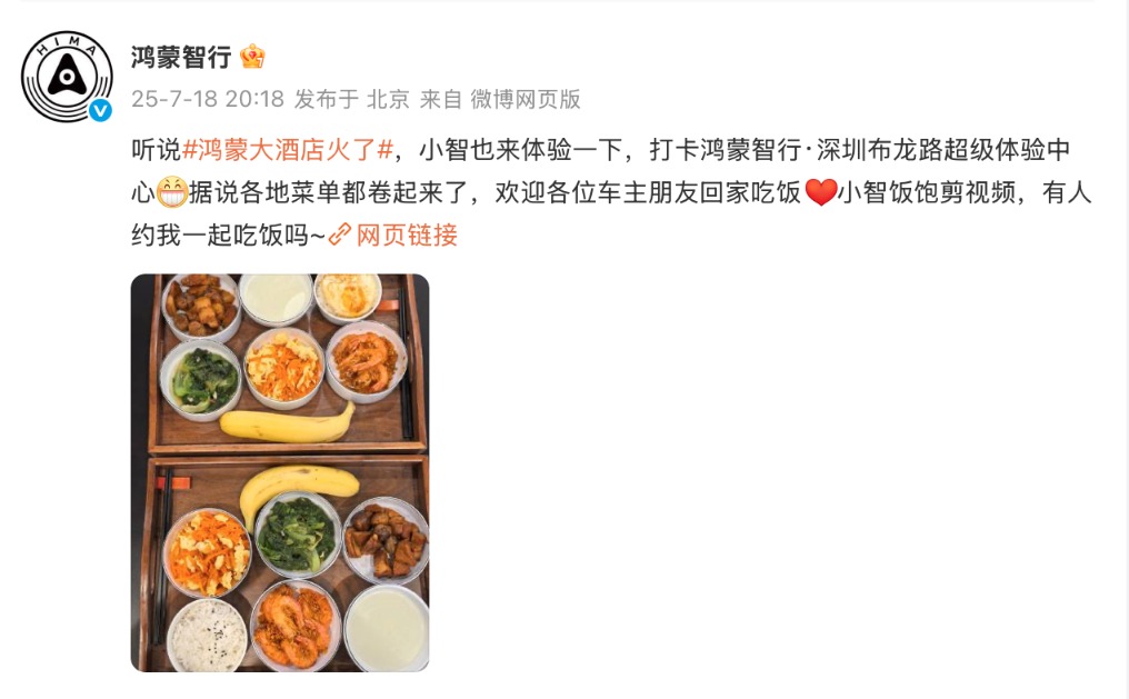 今年7月,华为常务董事、终端BG董事长余承东在内蒙古的鸿蒙智行用户中心吃夜宵,他发文称:“我们在全国超600个用户中心,推出了免费夏季车辆检测,其中有200余家支持鸿蒙智行星夜服务,方便用户下班之后来,检个车、用个餐放心回家。 ”