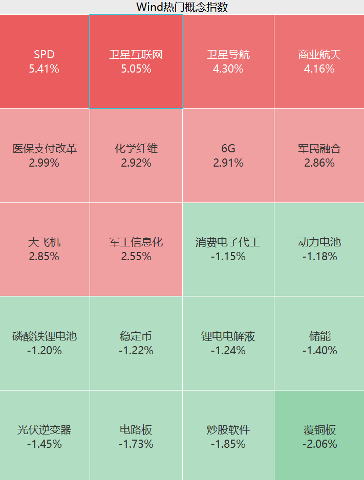 盘面上,国防军工、轻工制造、纺织服饰等板块走强,SPD、商业航天、6G等概念股火热,储能、锂电、覆铜板等概念股回调。
