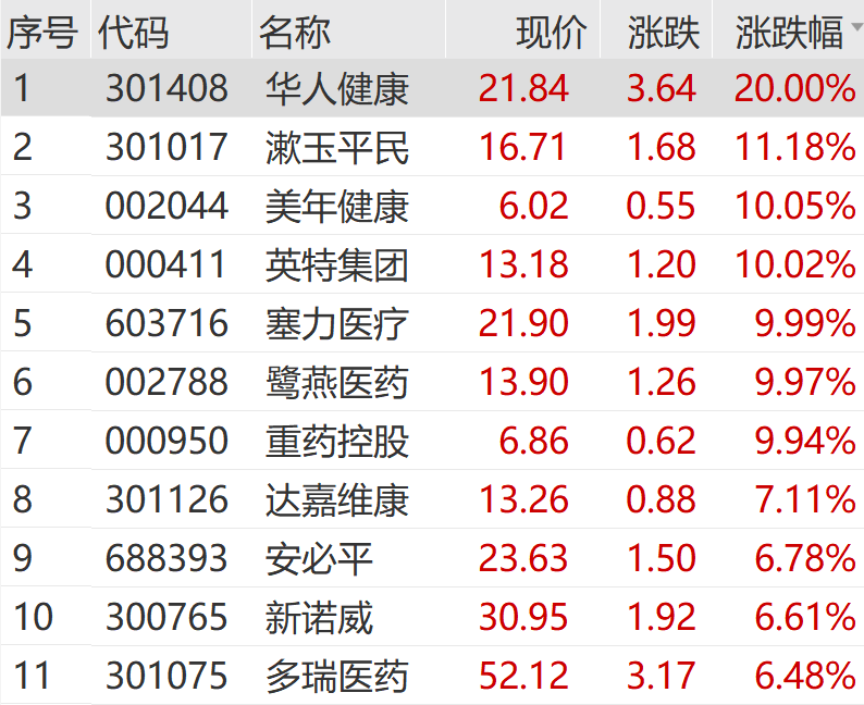 12月18日上午,医药板块盘初走强,SPD指数强势拉升。华人健康实现20cm涨停,英特集团、塞力医疗、重药控股等多股涨停。