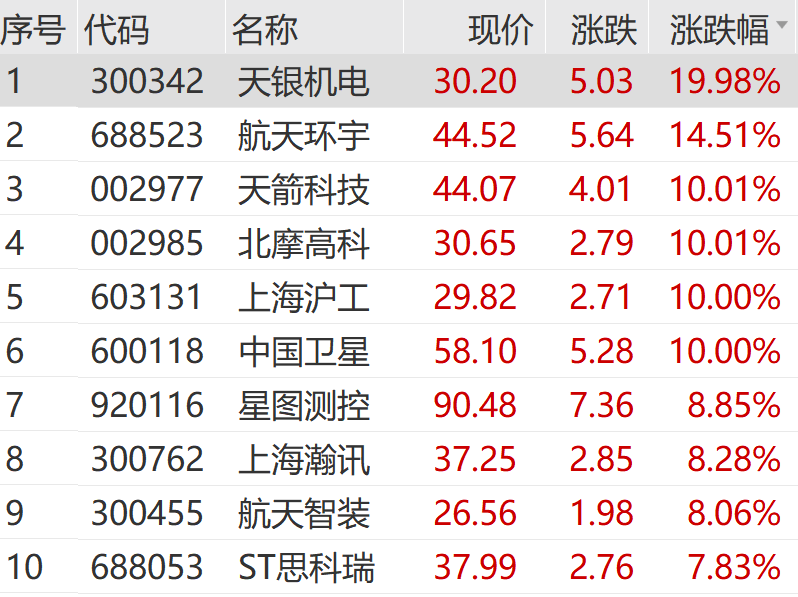 天银机电实现20cm涨停,天箭科技、北摩高科、上海沪工等多股涨停。