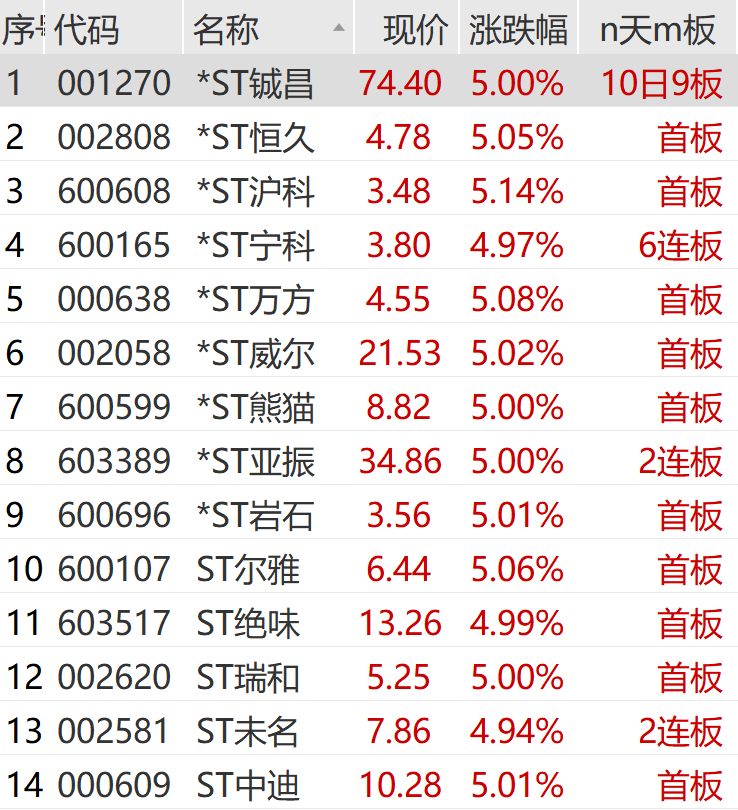 另外,上午ST板块整体火热,*ST铖昌走出10天9板,*ST宁科6连板,*ST亚振、ST未名等2连板。