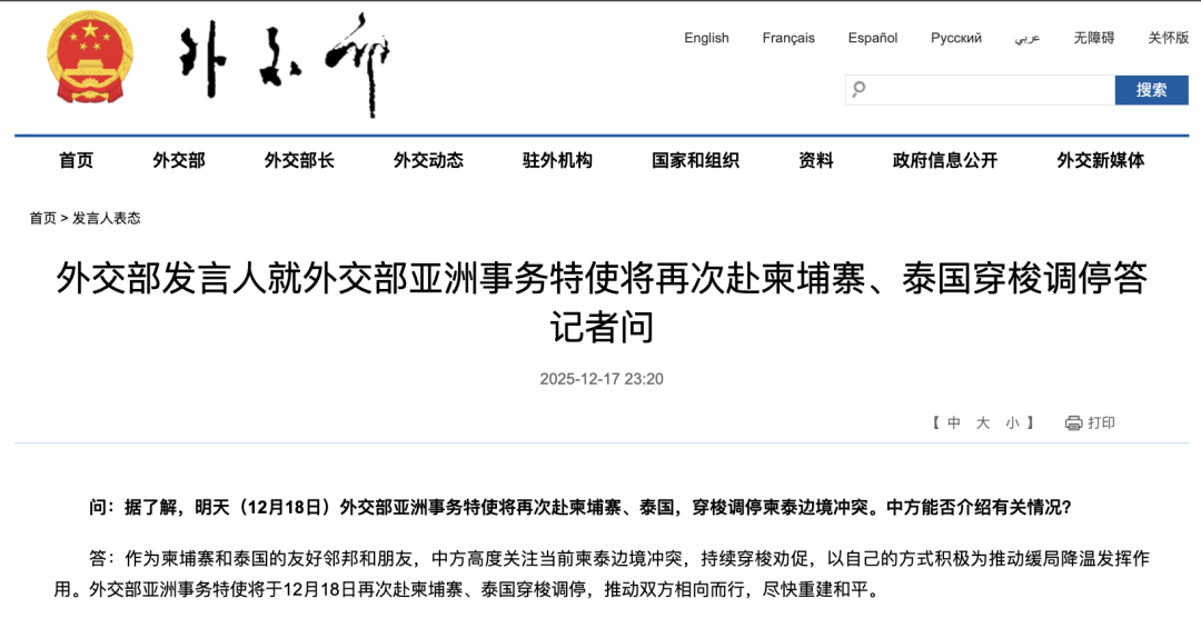 答:作为柬埔寨和泰国的友好邻邦和朋友,中方高度关注当前柬泰边境冲突,持续穿梭劝促,以自己的方式积极为推动缓局降温发挥作用。外交部亚洲事务特使将于12月18日再次赴柬埔寨、泰国穿梭调停,推动双方相向而行,尽快重建和平。