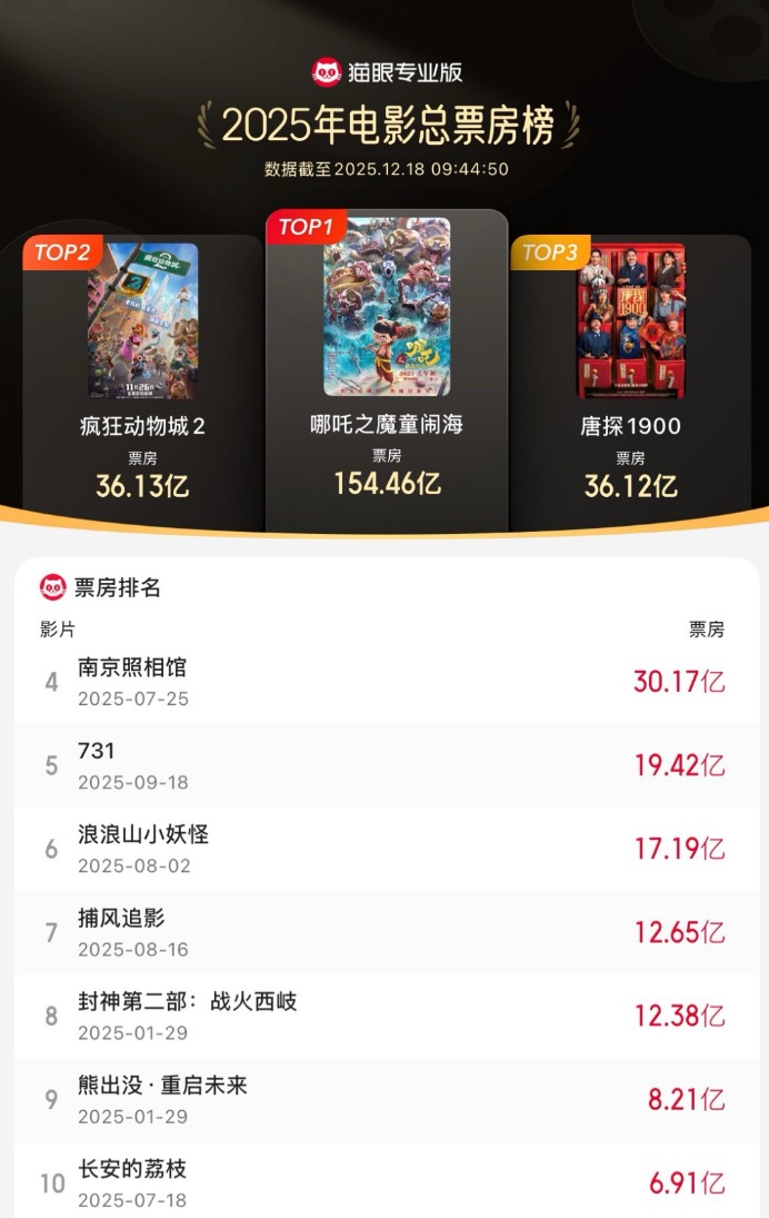 破36.13亿元 《疯狂动物城2》进入我国2025年度票房榜前二