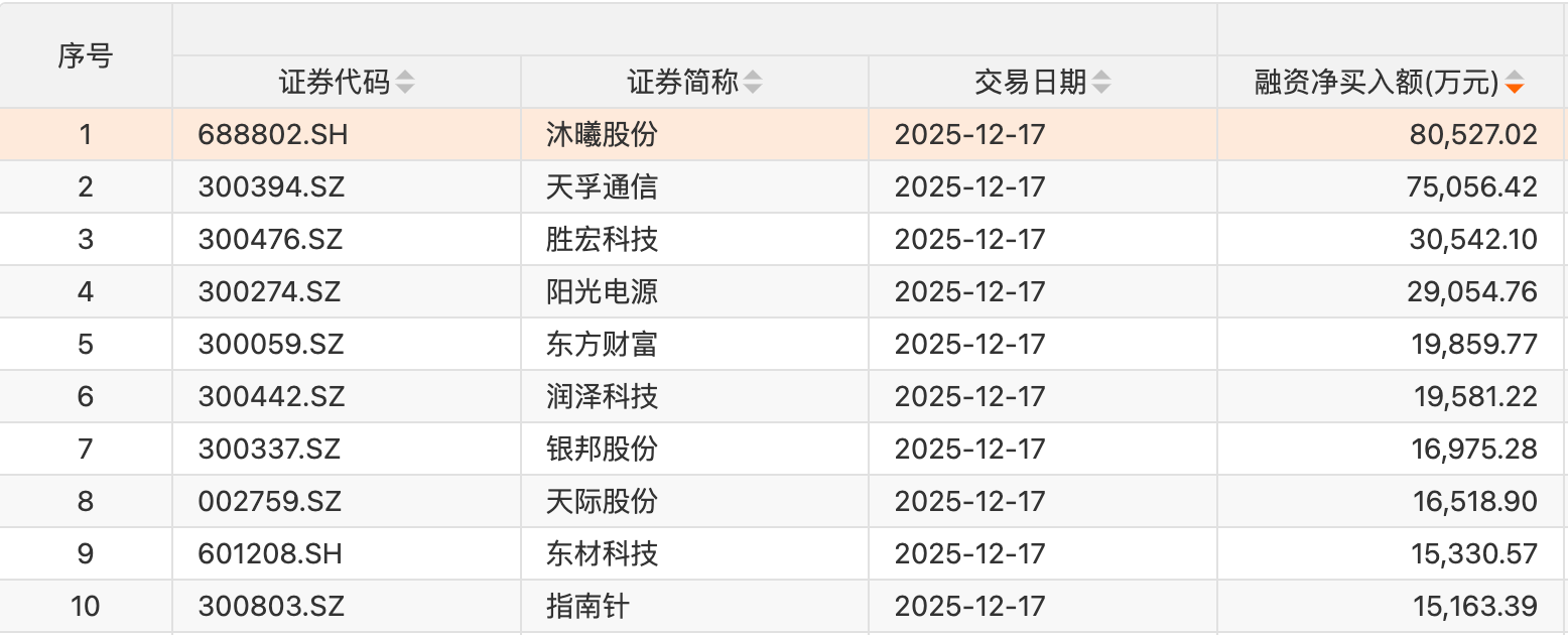 个股方面,21只个股获融资净买入额超1亿元。沐曦股份获融资净买入额居首,净买入8.05亿元;融资净买入金额居前的还有天孚通信、胜宏科技、阳光电源、东方财富、润泽科技、银邦股份、天际股份、东材科技、指南针等。