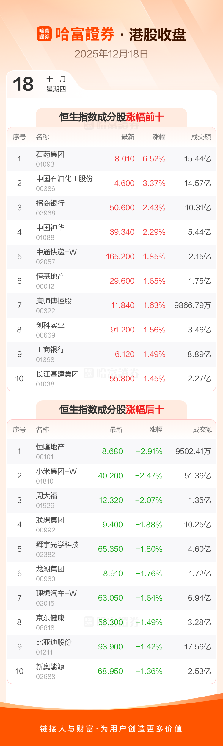港股12月18日收盘走高,恒生指数收报25498.13点,涨29.35点,涨幅0.12%;恒生科技指数收报5418.29点,跌39.66点,跌幅0.73%。恒生指数成分股中石药集团、中国石油化工股份、招商银行涨幅居前,恒隆地产、小米集团-W、周大福跌幅靠前。恒生科技指数成分股中零跑汽车、网易-S、阿里健康涨幅居前,商汤-W、小米集团-W、联想集团跌幅靠前。