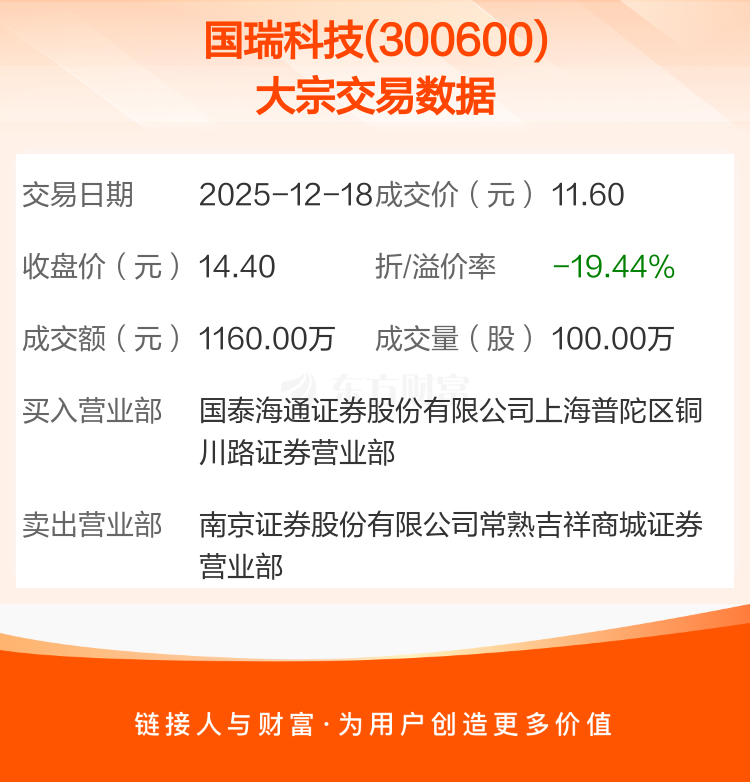 2025年12月18日,国瑞科技发生1笔大宗交易,共成交100.00万股,成交金额1160.00万元,占其流通市值比例为0.27%。