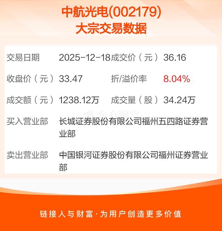 2025年12月18日,中航光电发生1笔大宗交易,共成交34.24万股,成交金额1238.12万元,占其流通市值比例为0.02%。