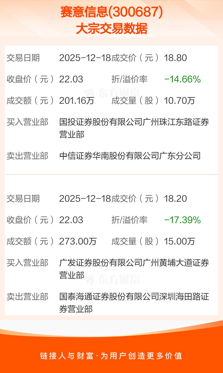 2025年12月18日,赛意信息发生2笔大宗交易,共成交25.70万股,成交金额474.16万元,占其流通市值比例为0.07%。