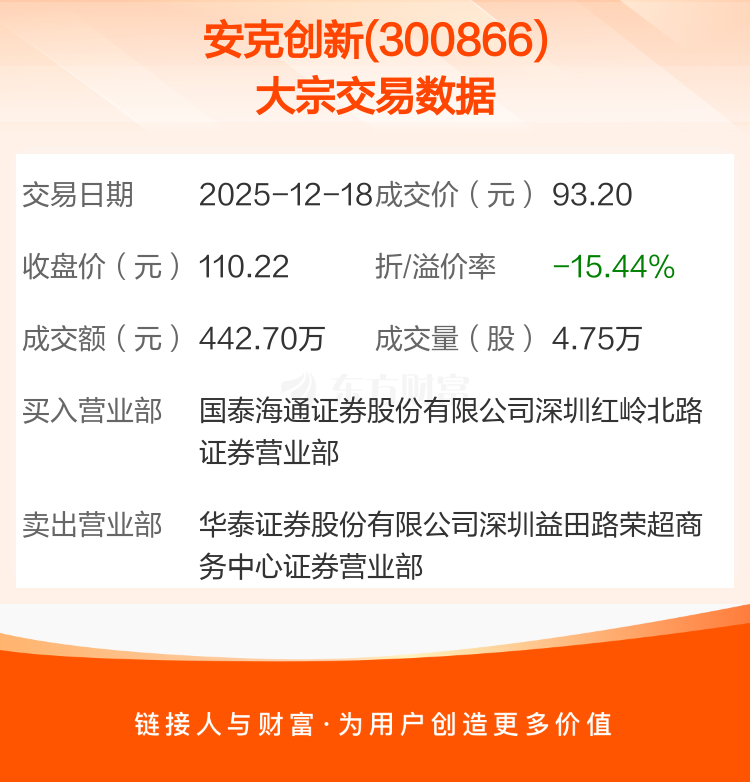 大宗交易:安克创新成交442.70万元,折价15.44%(12-18)