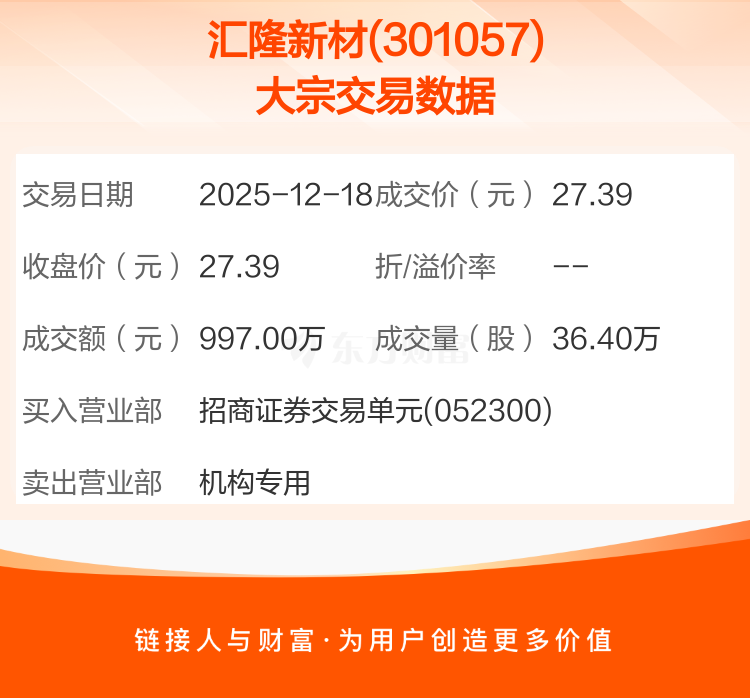 2025年12月18日,汇隆新材发生1笔大宗交易,共成交36.40万股,成交金额997.00万元,占其流通市值比例为0.44%。