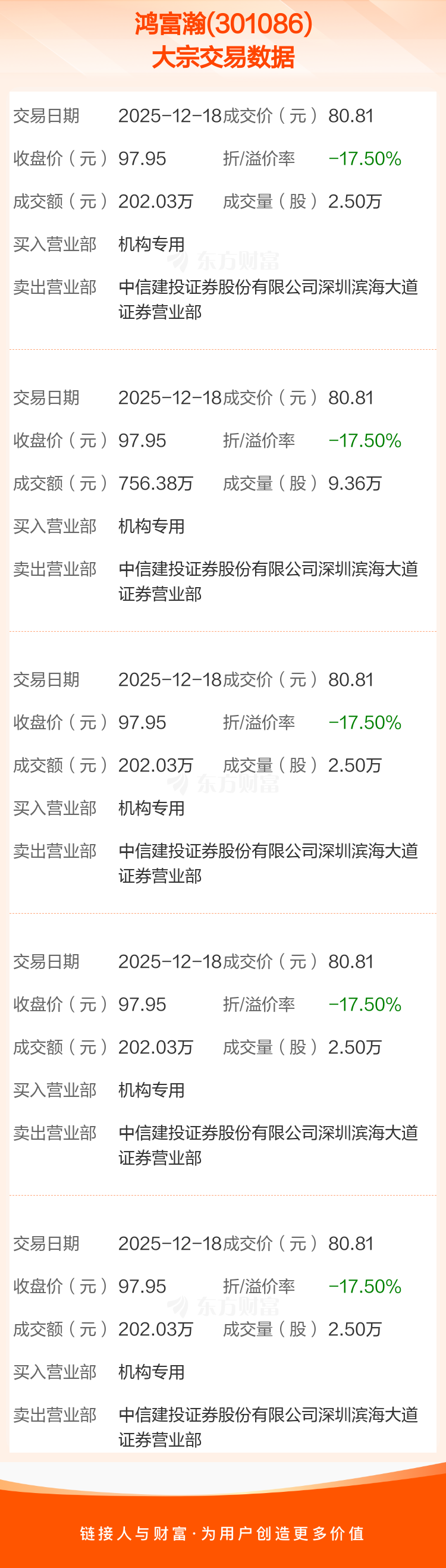 2025年12月18日,鸿富瀚发生5笔大宗交易,共成交19.36万股,成交金额1564.50万元,占其流通市值比例为0.34%。