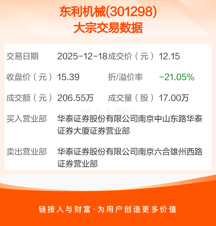 大宗交易:东利机械成交206.55万元,折价21.05%(12-18)