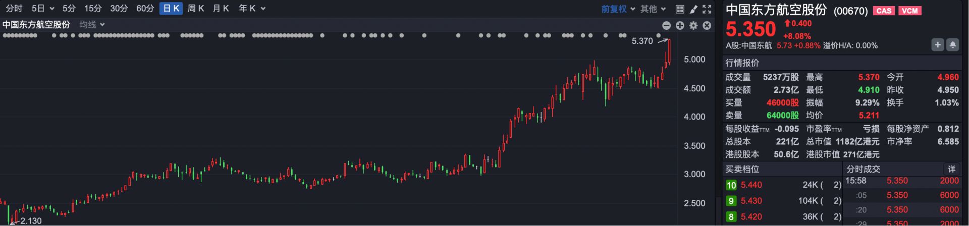 航空股方面,中国国航(HK00753)涨超4%,中国南方航空股份(HK01055)涨超5%,中国东方航空股份(HK00670)涨超8%,三大航空股均创出本轮行情新高。国泰海通证券指出,近日管理层再次强调央企应自觉抵制“内卷式”竞争。中国民航以央国企为主,客座率已创历史新高且全球居前,反内卷有望加速收益管理改善与盈利中枢上行。