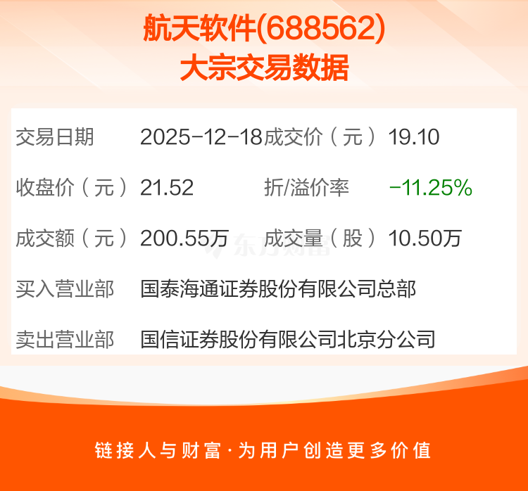 2025年12月18日,航天软件发生1笔大宗交易,共成交10.50万股,成交金额200.55万元,占其流通市值比例为0.05%