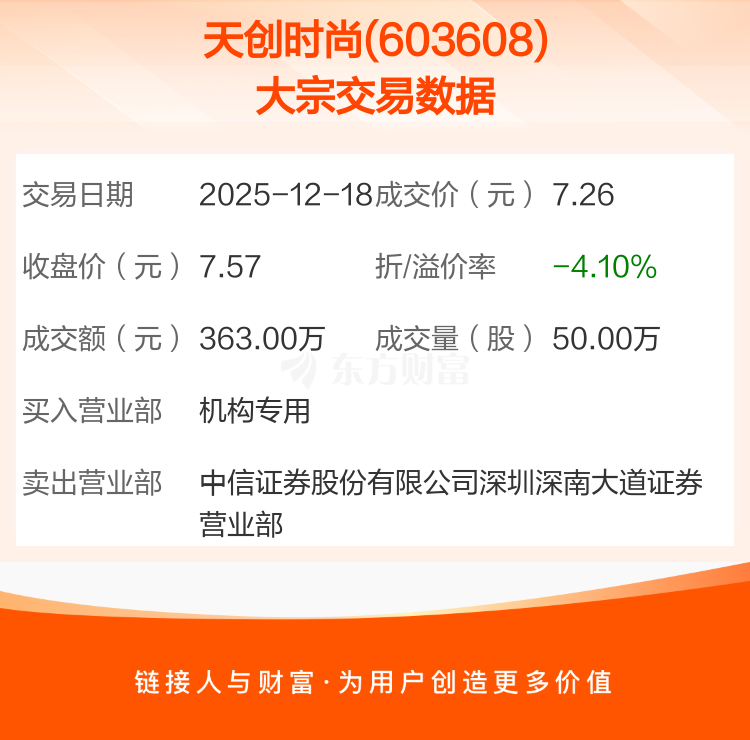 2025年12月18日,天创时尚发生1笔大宗交易,共成交50.00万股,成交金额363.00万元,占其流通市值比例为0.11%。