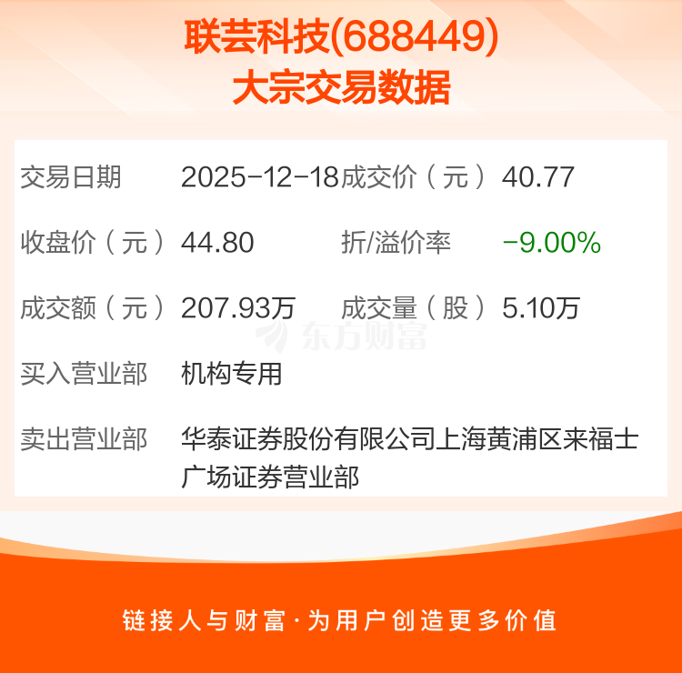 2025年12月18日,联芸科技发生1笔大宗交易,共成交5.10万股,成交金额207.93万元,占其流通市值比例为0.02%。
