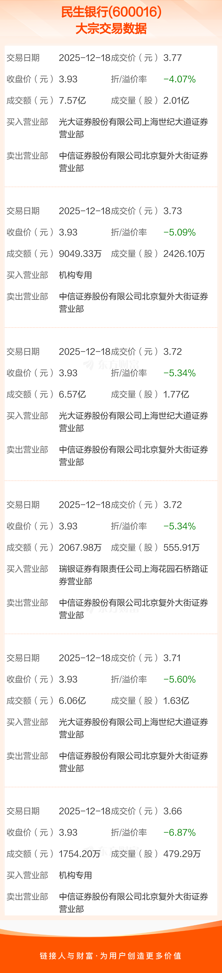2025年12月18日,民生银行发生6笔大宗交易,共成交5.75亿股,成交金额-21.46亿元,占其流通市值比例为1.54%。