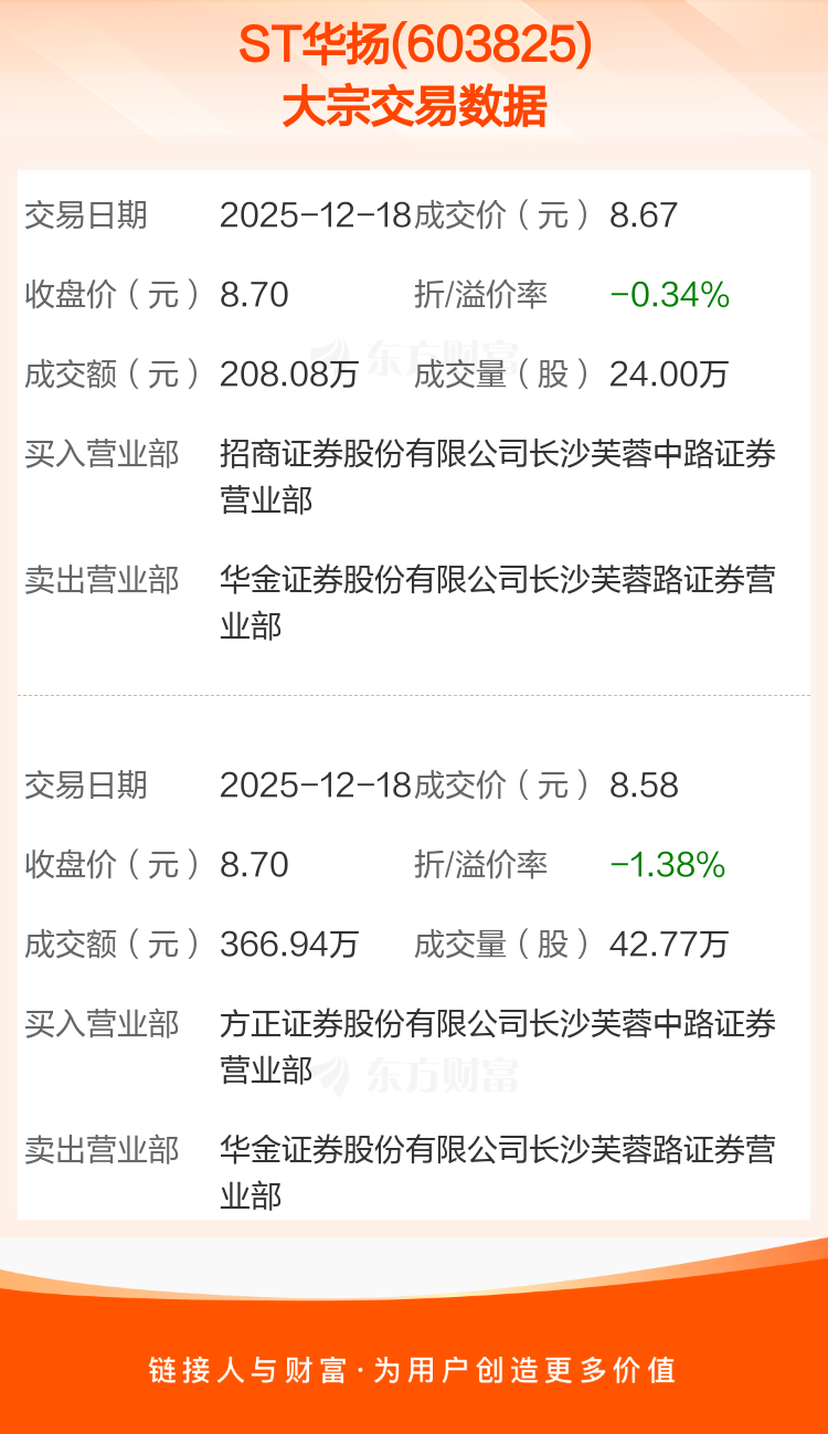 2025年12月18日,ST华扬发生2笔大宗交易,共成交66.77万股,成交金额575.02万元,占其流通市值比例为0.26%。