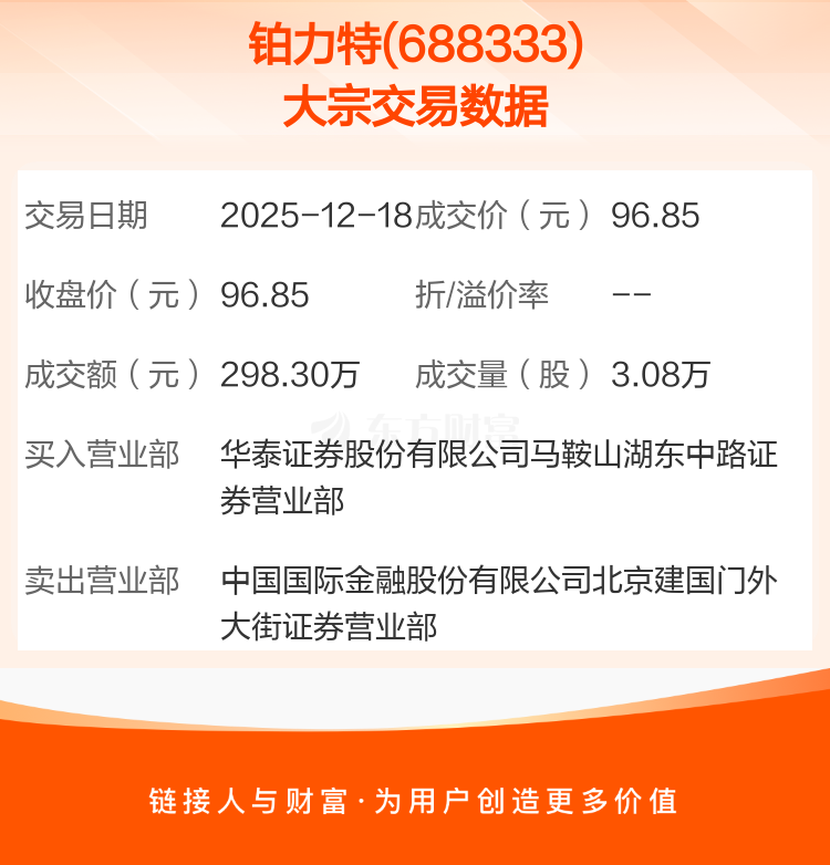 2025年12月18日,铂力特发生1笔大宗交易,共成交3.08万股,成交金额298.30万元,占其流通市值比例为0.01%。