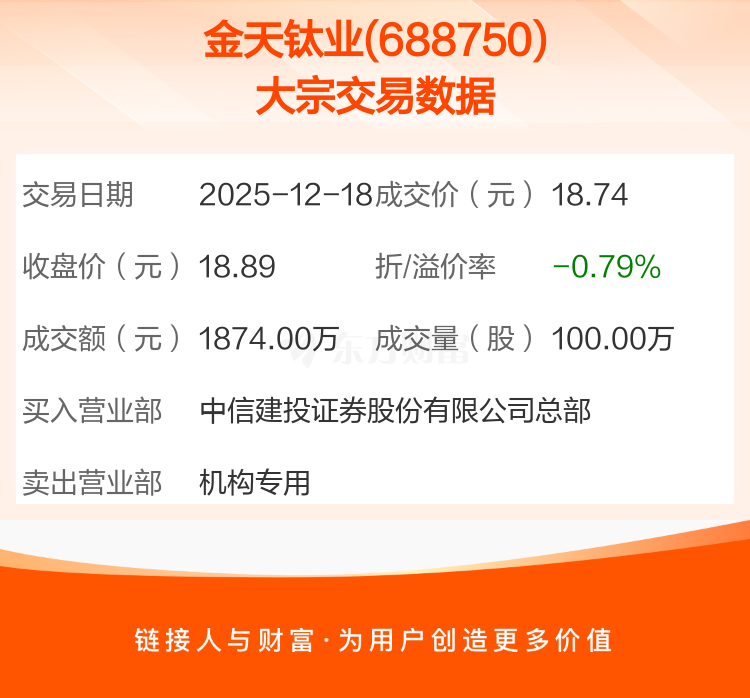 大宗交易:金天钛业成交1874.00万元,折价0.79%(12-18)