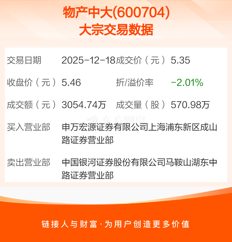 2025年12月18日,物产中大发生1笔大宗交易,共成交570.98万股,成交金额3054.74万元,占其流通市值比例为0.11%。
