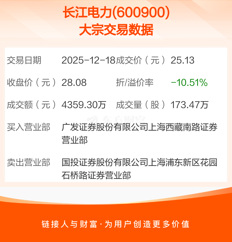 2025年12月18日,长江电力发生1笔大宗交易,共成交173.47万股,成交金额4359.30万元