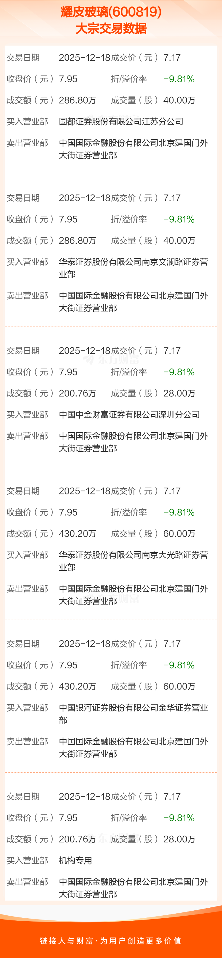 2025年12月18日,耀皮玻璃发生6笔大宗交易,共成交256.00万股,成交金额1835.52万元,占其流通市值比例为0.31%。