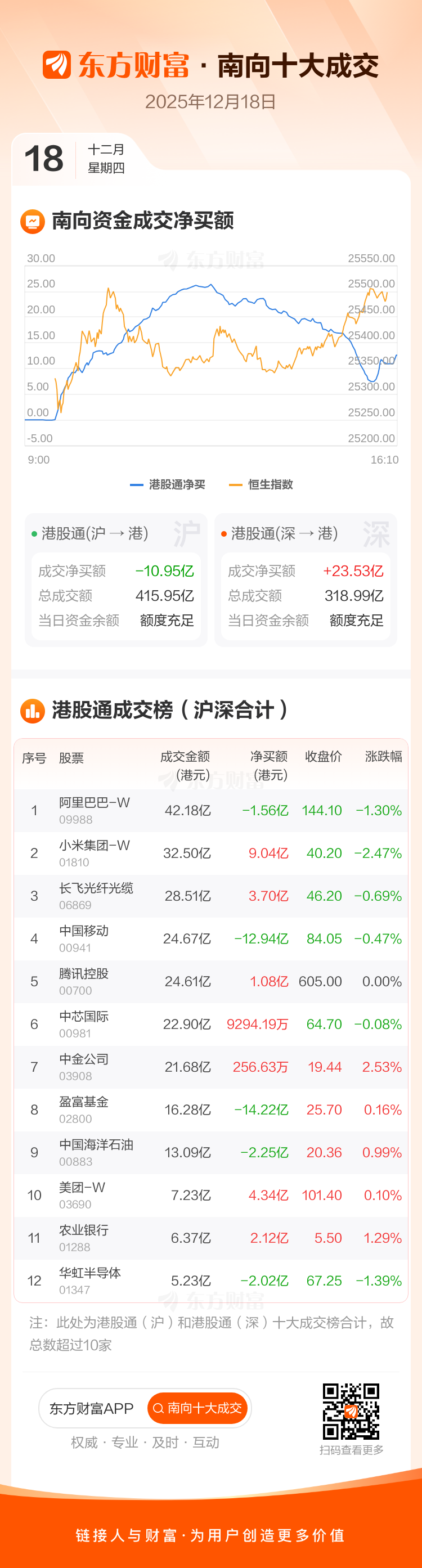12月18日南向资金净买逾12亿港元,逾9亿抢筹小米集团-W