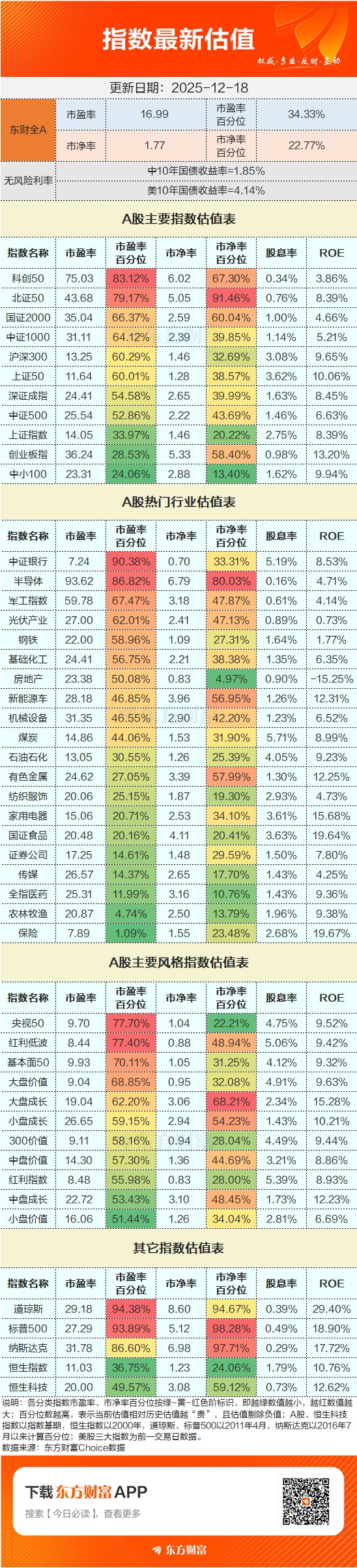 截至12月18日收盘,东方财富Choice数据显示,东财全A市盈率为16.99倍,市盈率百分位为34.33%;市净率为1.77倍,市净率百分位为22.77%。