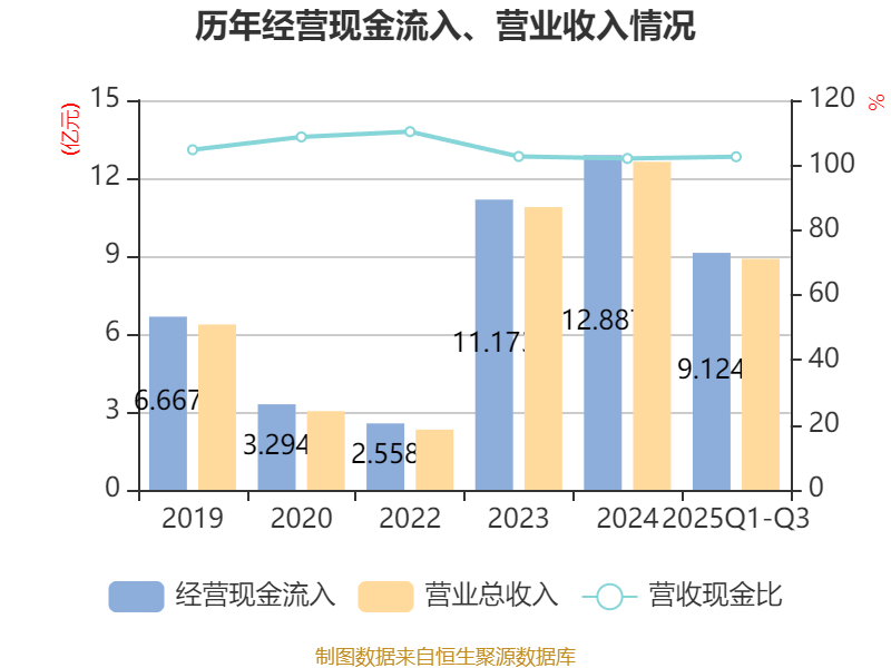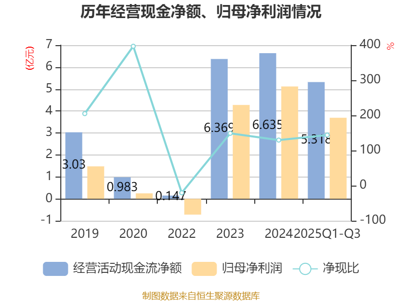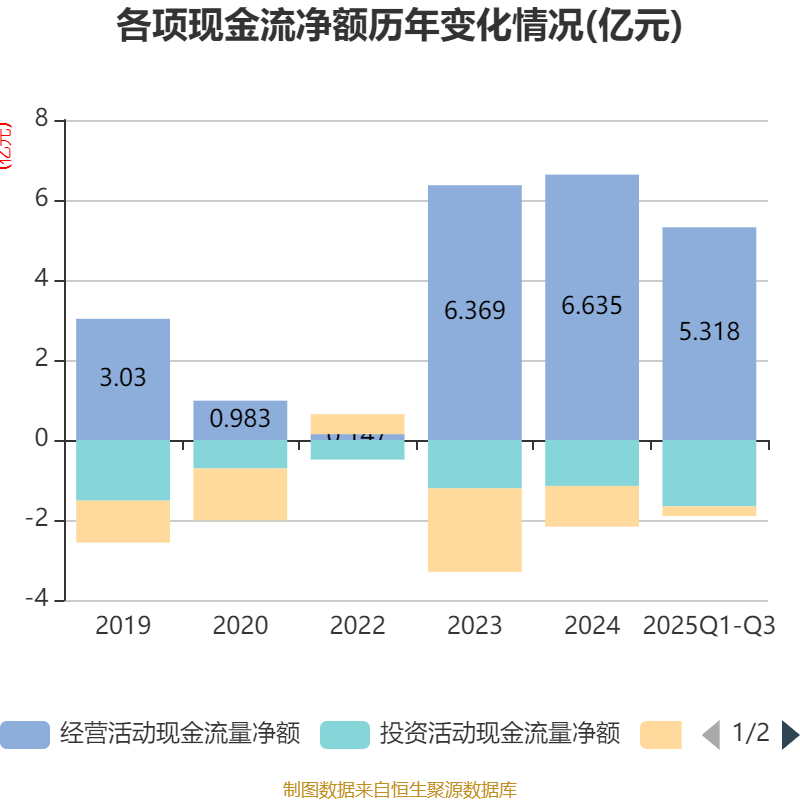2025年前三季度,公司经营活动现金流净额为5.32亿元,同比下降23.63%;筹资活动现金流净额-2435.57万元,同比增加7393.73万元;投资活动现金流净额-1.66亿元,上年同期为-8243.83万元。
