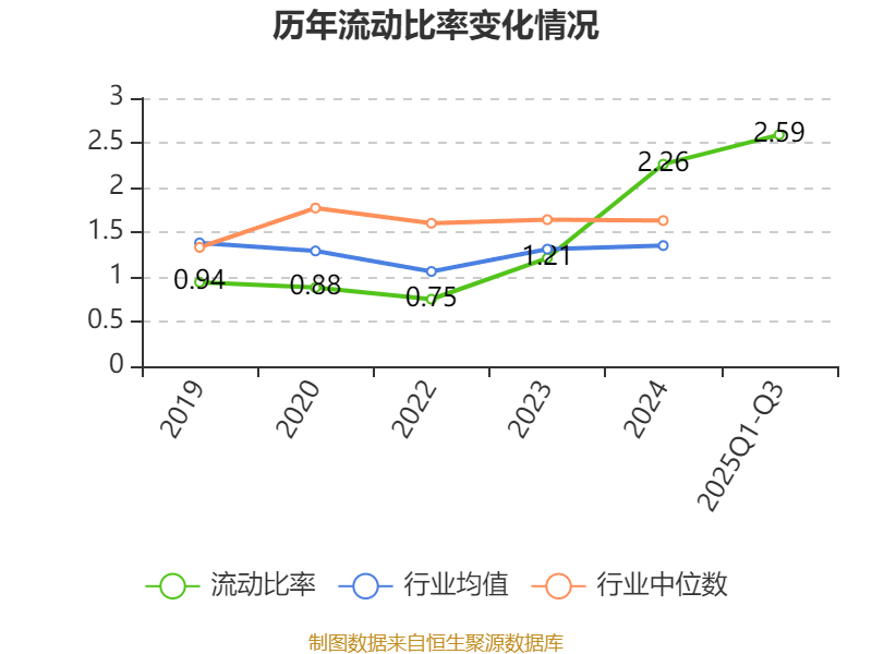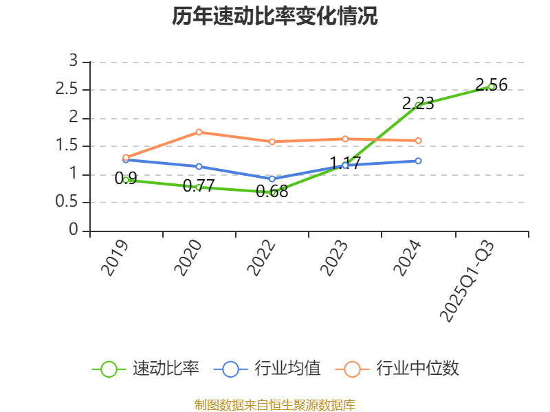 2024年,公司流动比率为2.26,速动比率为2.23。2025年前三季度,公司流动比率为2.59,速动比率为2.56。