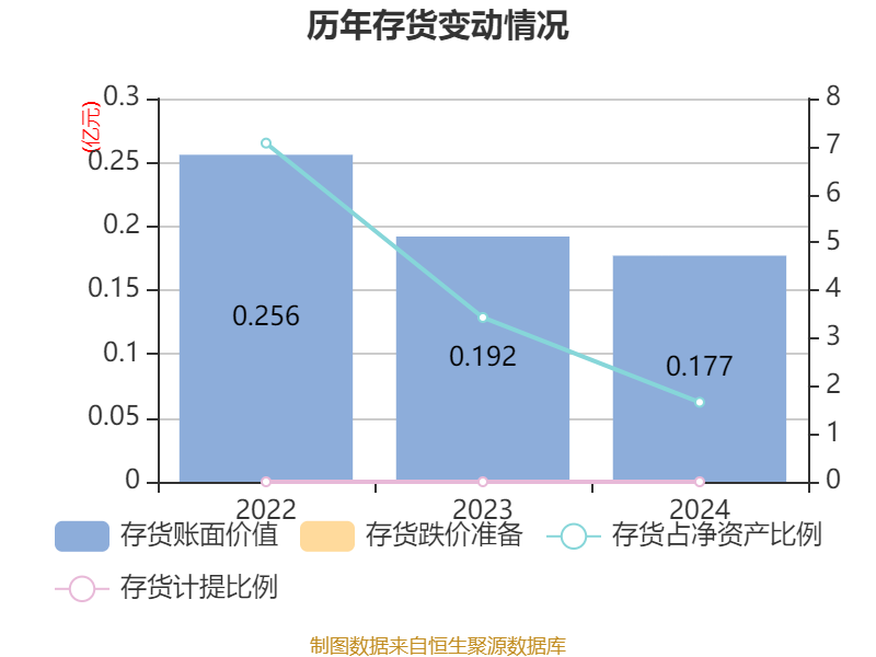 从存货变动来看,截至2024年末,公司存货账面价值为1772.58万元,占净资产的1.66%,较上年末减少151.49万元。公司本期没有计提存货跌价准备。