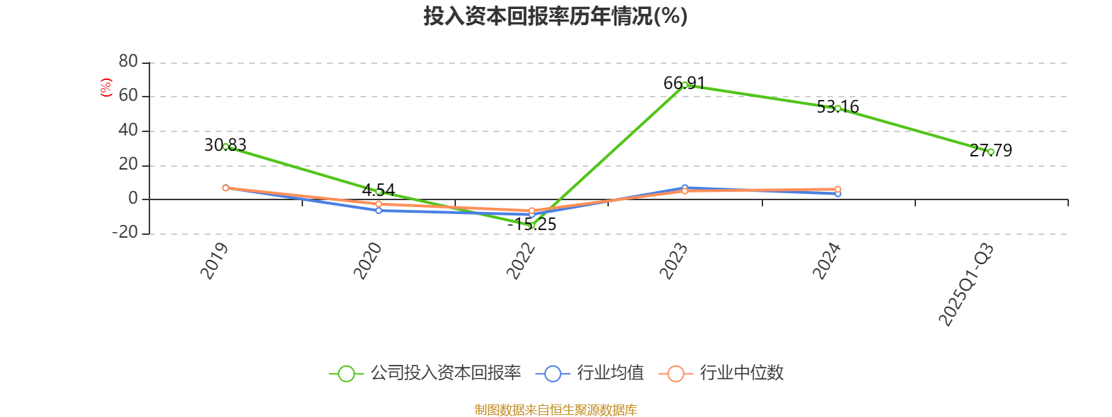公司2024年投入资本回报率为53.16%,较上年同期下降13.75个百分点。2025年前三季度投入资本回报率为27.79%,较上年同期下降103.74个百分点。