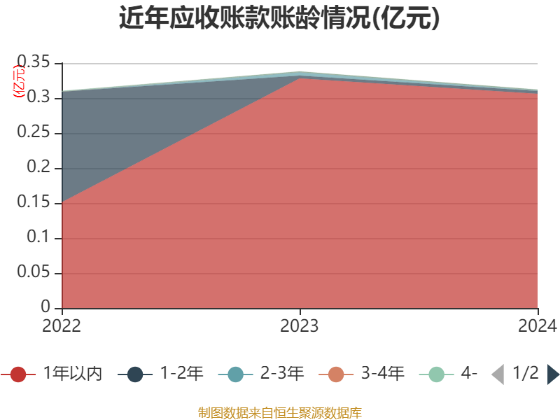 从应收账款账龄结构来看,截至2024年末,公司账龄在1年以内的应收账款余额为0.31亿元,较上年末下降229.44万元,占应收账款总额比例为97.84%,较上年末下降8.3个百分点。