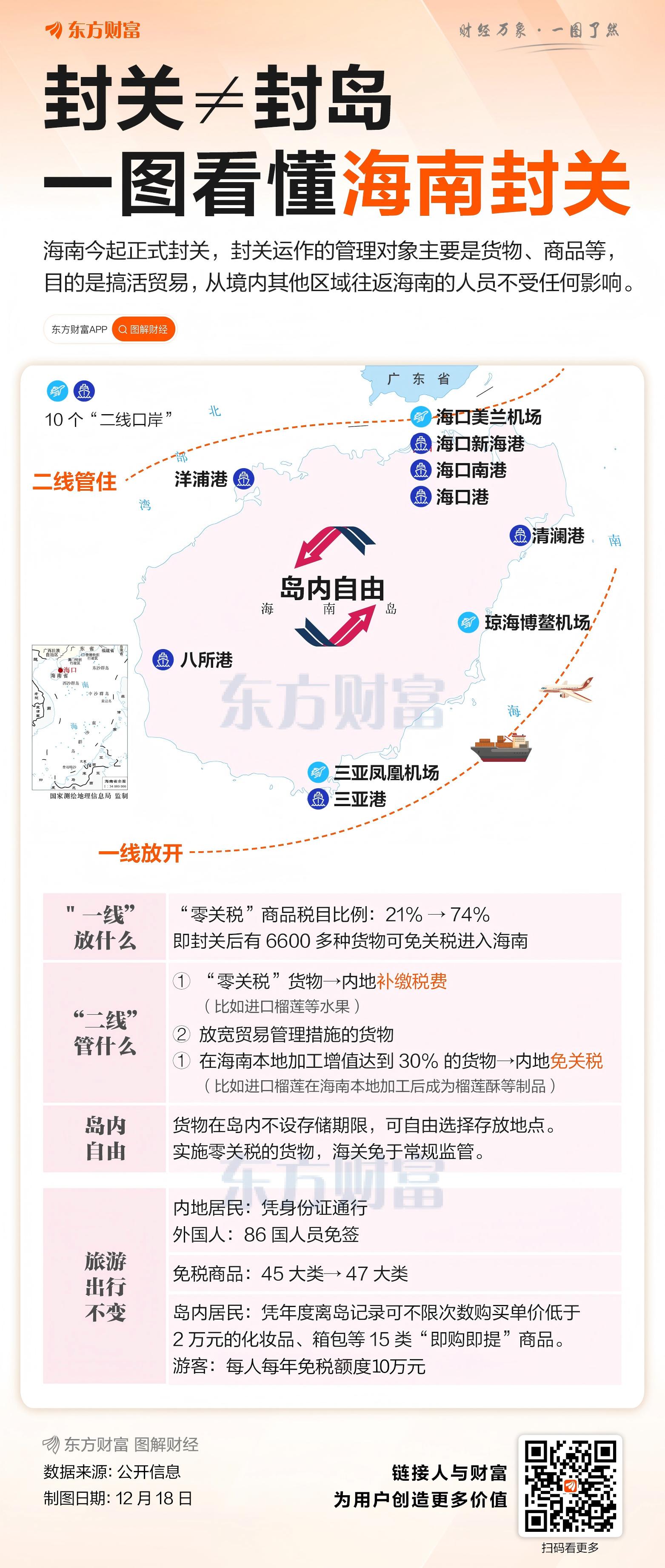 12月18日,海南自由贸易港全岛封关运作正式启动,实施“一线放开、二线管住、岛内自由”政策,海南岛成为我国最大海关特殊监管区域。封关后零关税商品增至6600多种,覆盖74%的商品类目。