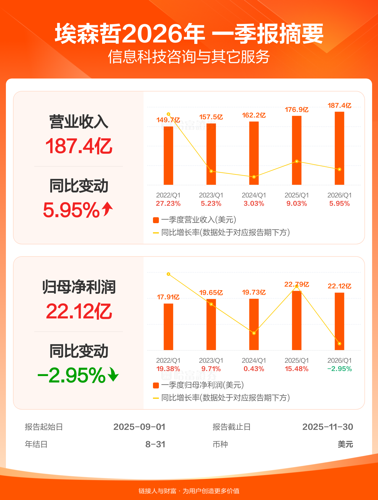 埃森哲12月18日发布一季报业绩,截至2025年11月30日的3个月内,该公司营业收入187.42亿元(美元,下同),同比增长5.95%;公司权益持有人应占溢利(归母净利润)22.12亿元,同比减少2.95%