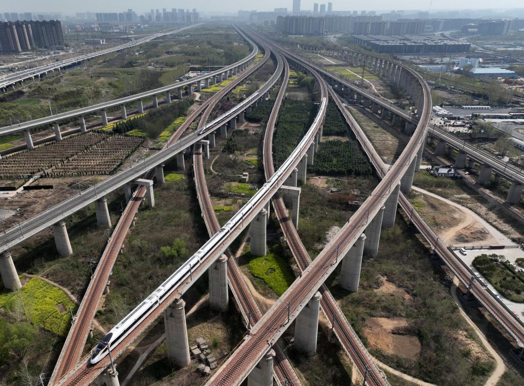 2025年3月31日在河南省郑州市拍摄的纵横交错的高铁线路(无人机照片)。新华社记者李嘉南摄