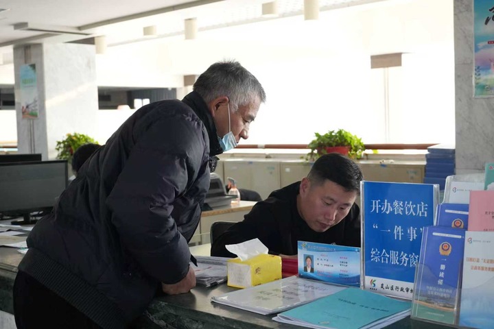 在山东省日照市岚山区行政审批服务局的办事大厅内,市民在“一件事”综合受理窗口办理业务。丁明杰摄