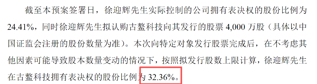 此外,古鳌科技还计划向徐迎辉进行定向增发。根据定增预案,公司拟向徐迎辉发行股票数量不超过4000万股,发行价格为10.8元/股。本次发行拟募集不超过4.32亿元,扣除发行费用后,全部用于补充流动资金。本次向特定对象发行股票完成后,在不考虑其他因素可能导致股本数量变动的情况下,按照拟发行股数上限计算,徐迎辉在古鳌科技拥有表决权的股份比例为32.36%。