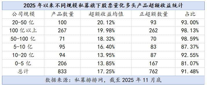 规模维度上,头部私募与中等规模私募展现出明显的超额收益优势。数据显示,20亿至50亿元规模私募旗下股票量化多头产品表现最为亮眼,以20.12%的平均超额收益位居各规模梯队首位。同时,93%的产品实现正超额,表明多数产品表现较好。
