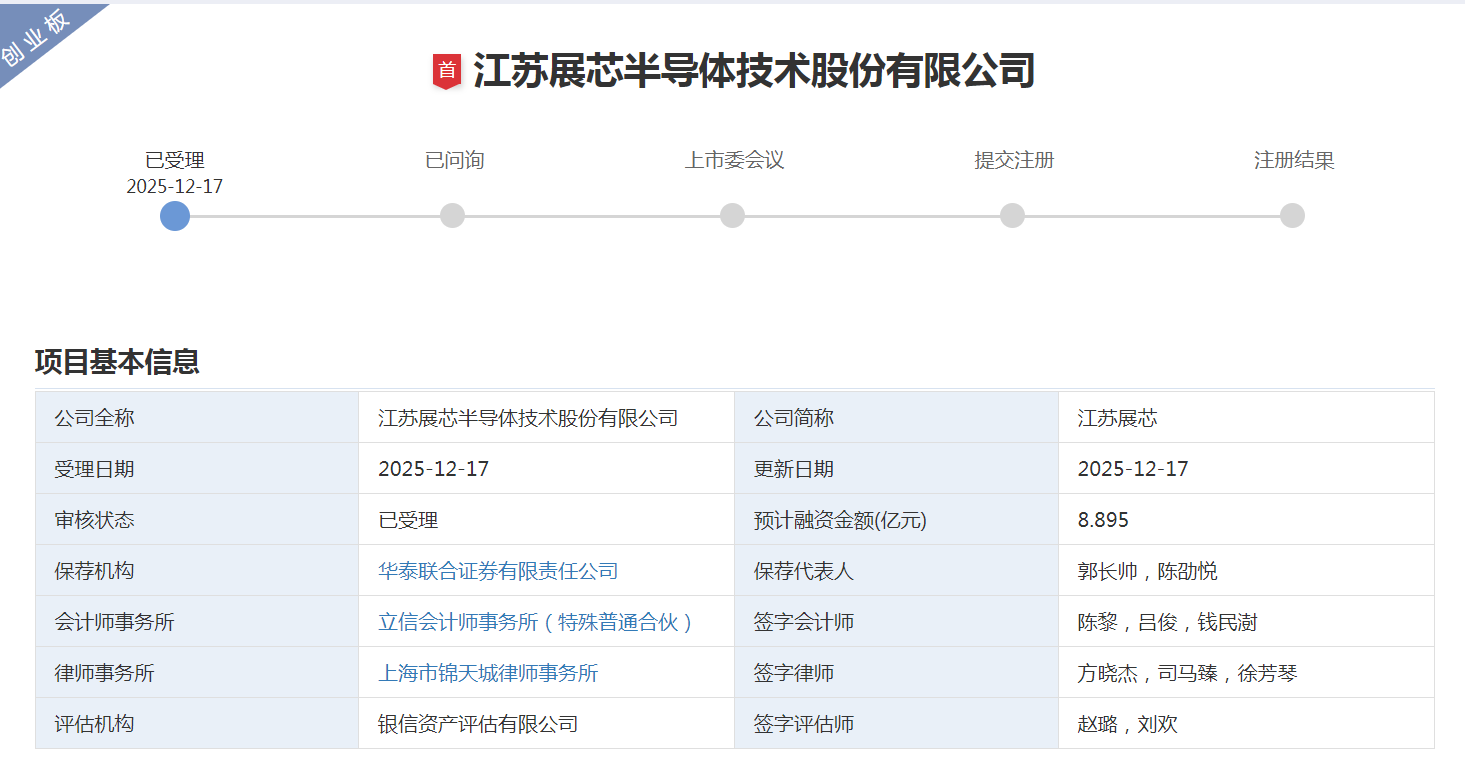 深交所官网显示,12月17日,江苏展芯半导体技术股份有限公司(以下简称“江苏展芯”)创业板IPO获得受理。
