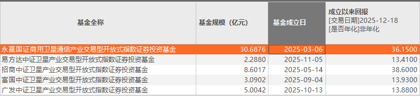 具体来看,截至12月18日,永赢卫星ETF和招商卫星产业ETF成立以来回报率双双超过30%,易方达卫星ETF、富国卫星ETF和广发卫星ETF成立以来回报率均超过10%。