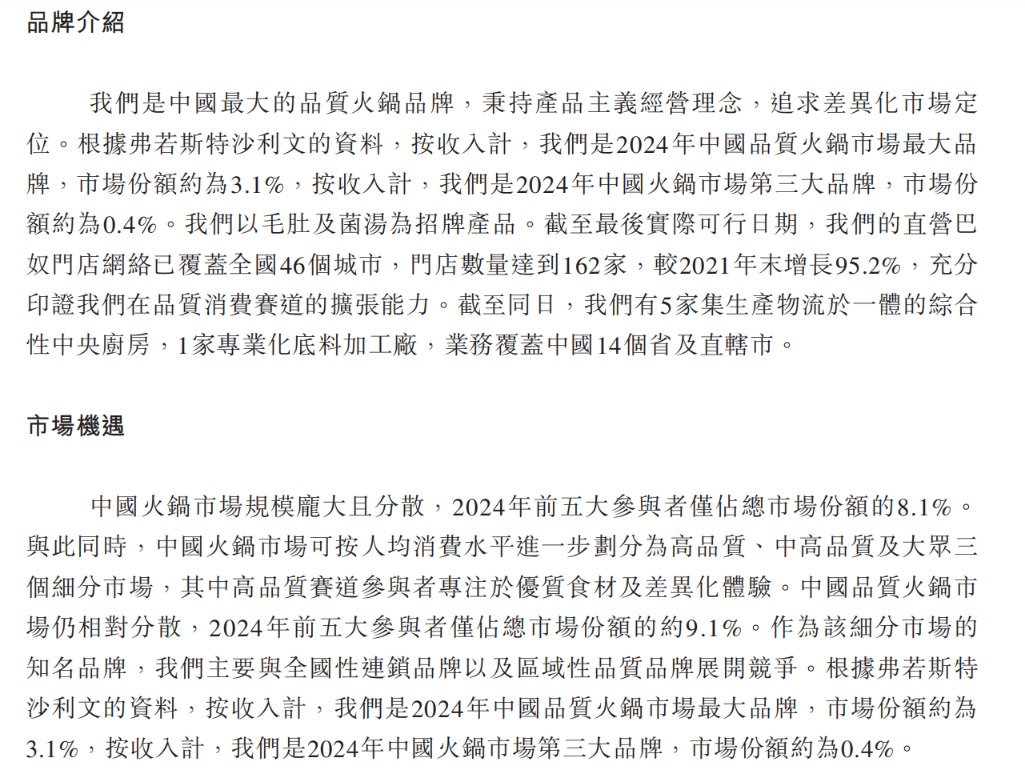 12月17日,巴奴国际控股有限公司(以下简称“巴奴火锅”或“公司”)更新招股书,中金公司、中银国际为联席保荐人。根据招股书,巴奴火锅成立于2001年4月,总部位于河南省郑州市,创始人为杜中兵。弗若斯特沙利文数据显示,按收入计,巴奴火锅在2024年中国火锅市场中的排名位于海底捞、呷哺呷哺之后,位列第三,市场份额约为0.4%;在中国高端火锅市场则排名第一,市场份额约为3.1%。